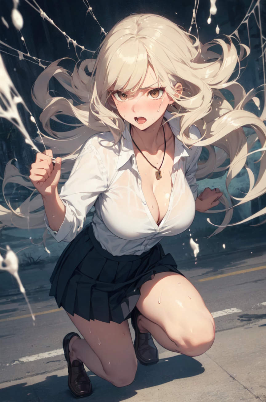 細かい糸に動きを奪われたひよりは、身を捻りきれず正面からそれを浴びてしまう。